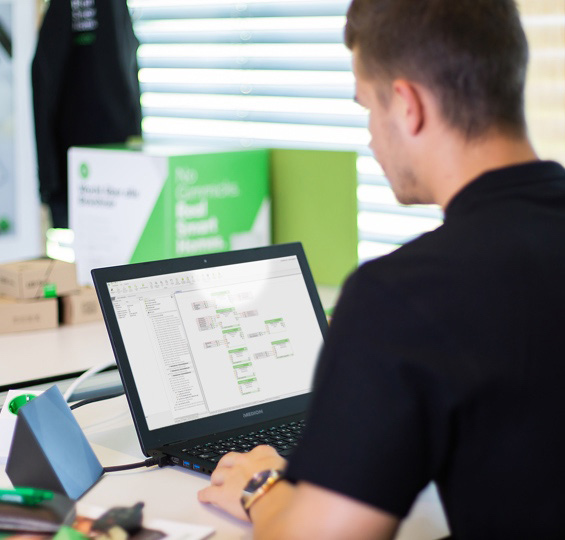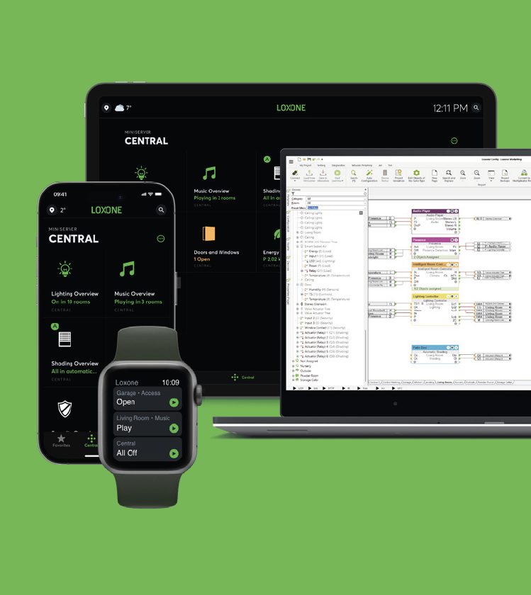Mit der kostenfreien Loxone Config und über 300 fertigen Bausteinen lassen sich Projekte individuell und in kürzester Zeit planen. Dank Autokonfiguration genügt nach der Installation ein Knopfdruck, um sämtliche Funktionen zu aktivieren – ein Prozess, der früher Tage in Anspruch nahm.